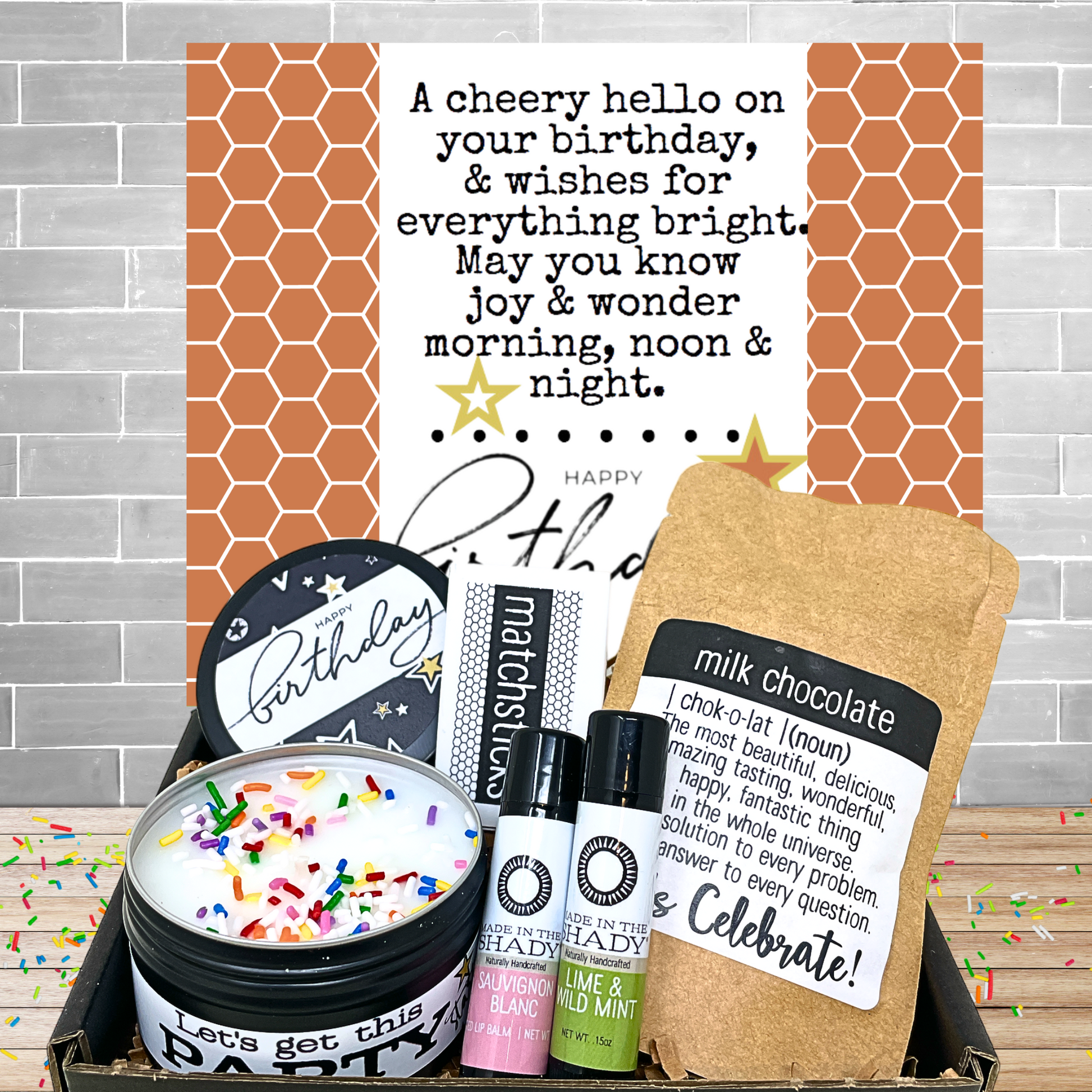 This customizable birthday quick pick is the perfect treat package, thoughtfully put together with handcrafted celebrations that will spark immediate happiness! This gift will show your care from afar and will be helpful in her birthday self-care celebration! Better than a card...this brilliant little birthday gift will take the cake!