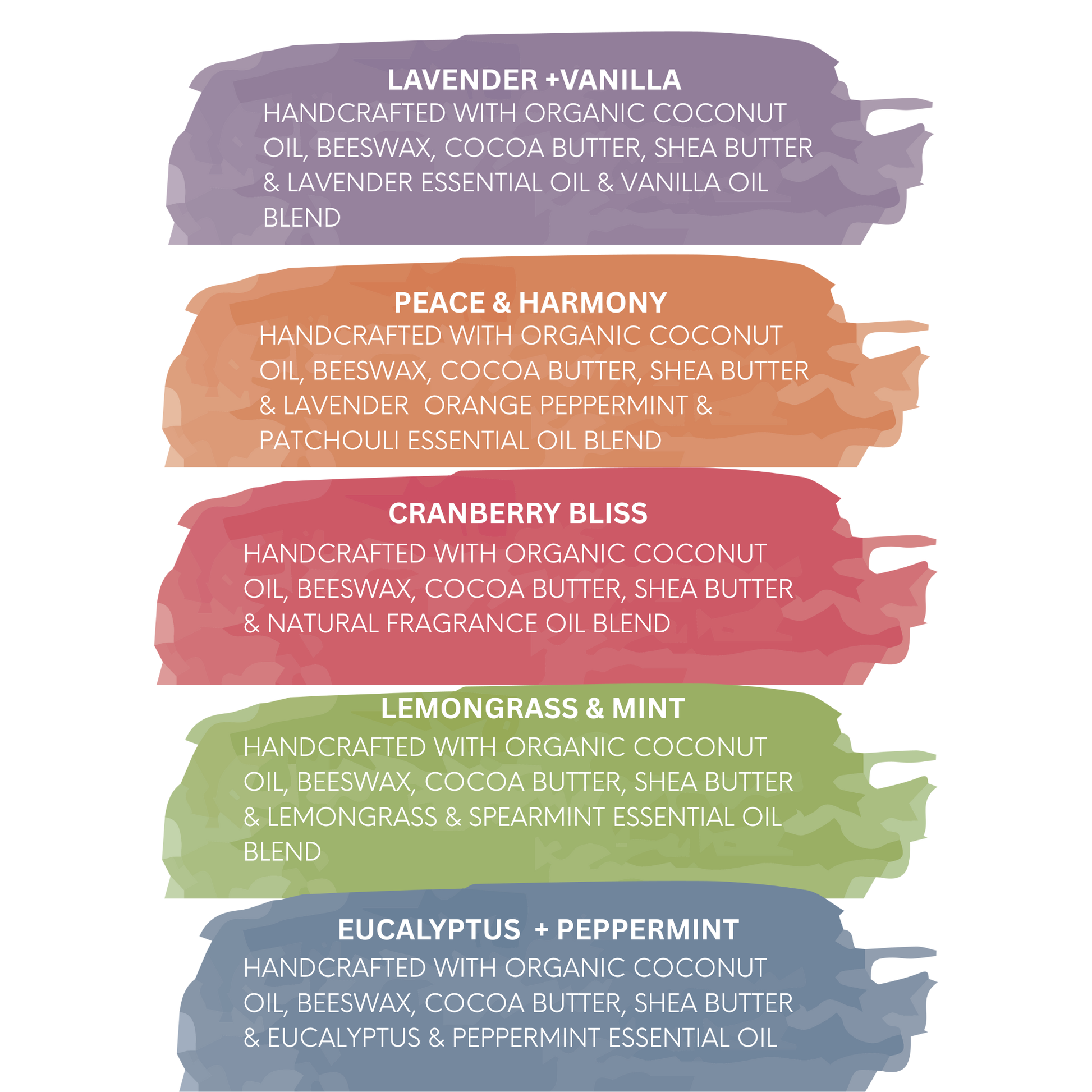 Peace +Harmony: Lavender+Peppermint+Citrus+PatchouliSimply Handcrafted with Coconut Oil*, Beeswax*, Cocoa Butter*, Shea Butter*, Essential Oil Blend