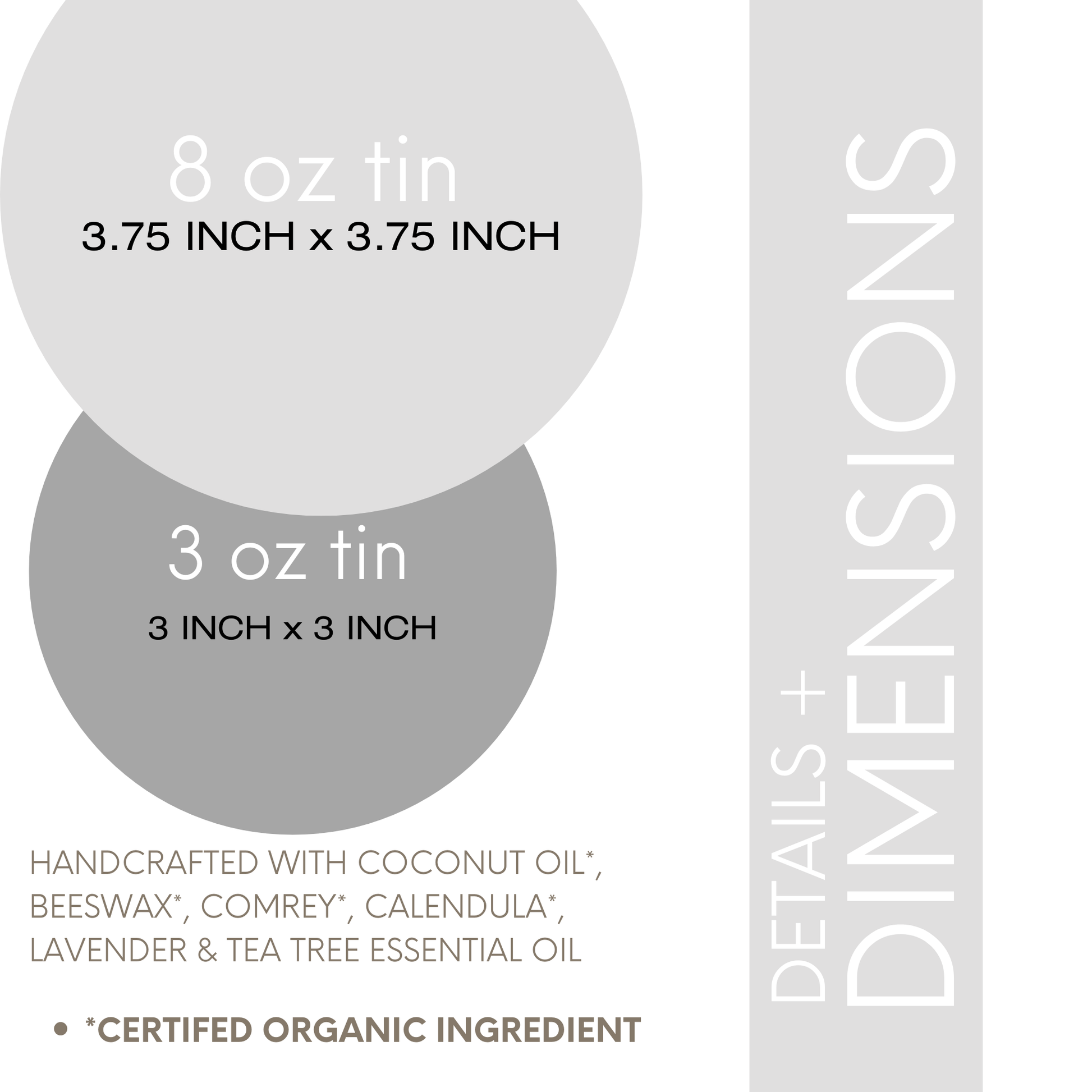 Handcrafted in small batches with infused Beeswax*, Coconut Oil* with Comfrey Leaves* & Calendula Petals*. Lavender & Tea Tree Essential Oil Blend.