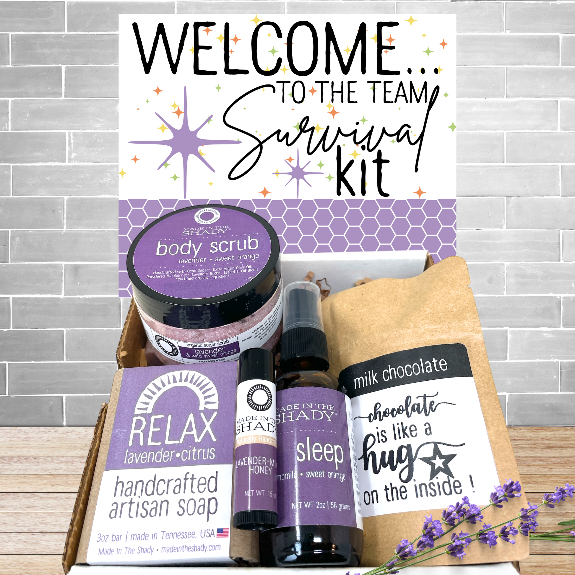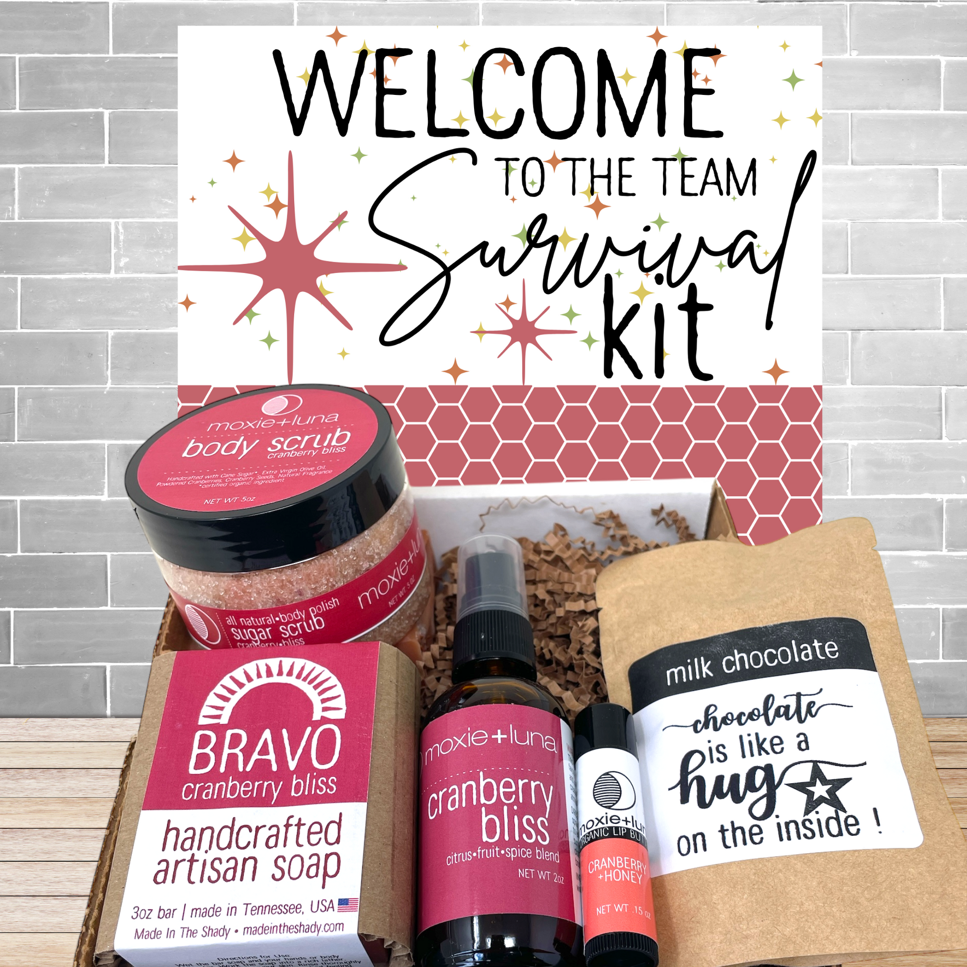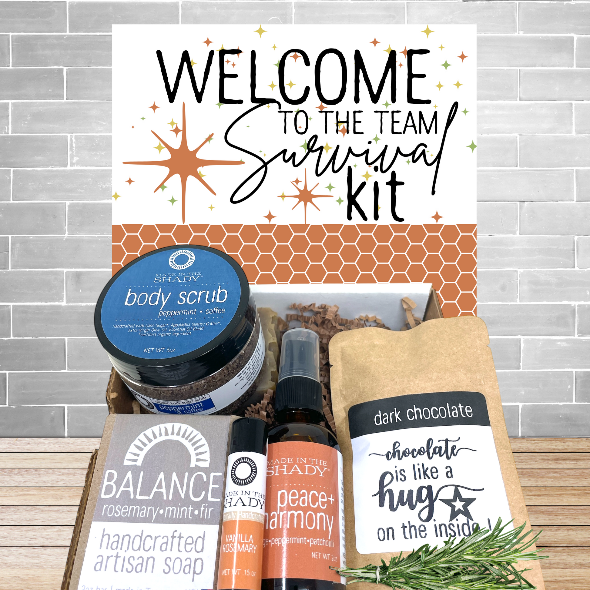 Packaged with care in a gift-ready box and labeled “Welcome to the Team" Survival Kit