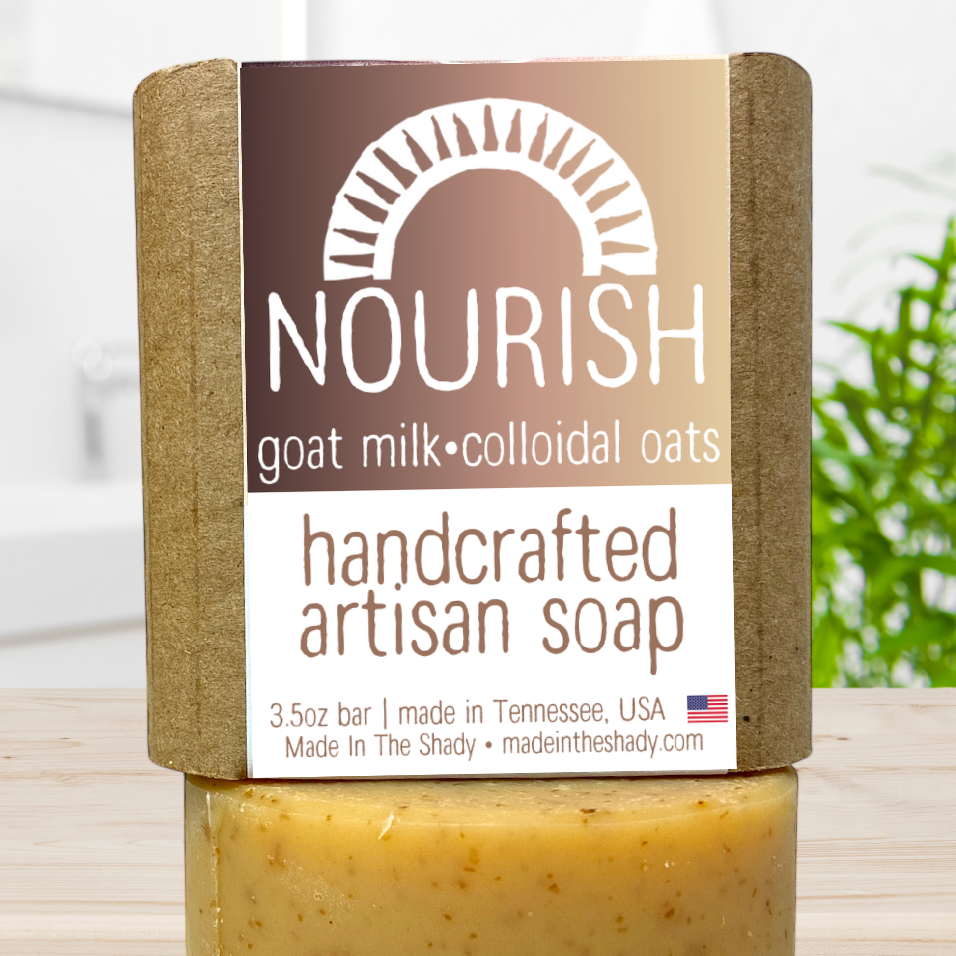 NOURISH: Goat Milk with Colloidal Oats+HoneyHandcrafted with Coconut Oil, Extra Virgin Olive Oil, Castor Oil*, Goat Milk*, Gluten Free Oats*, Raw Honey*, No added scent