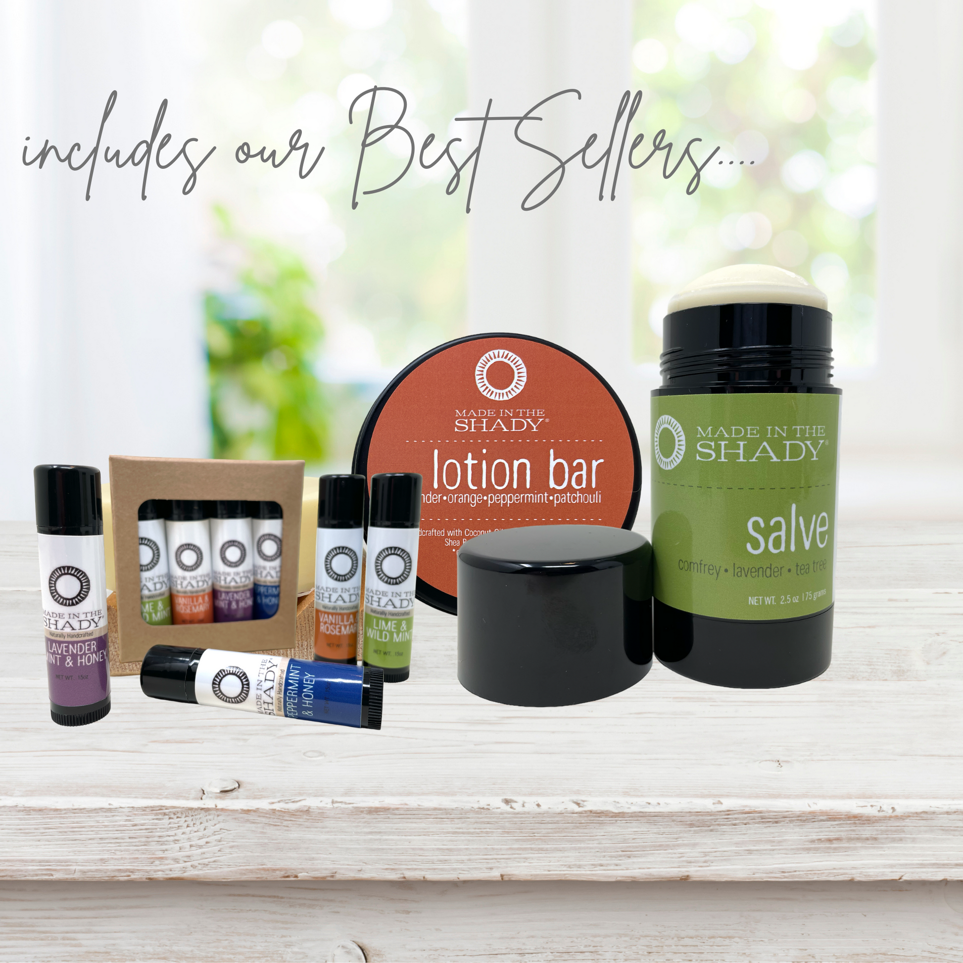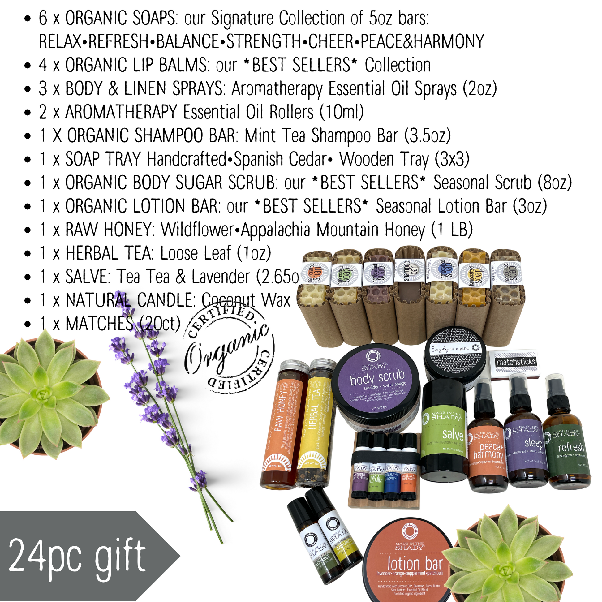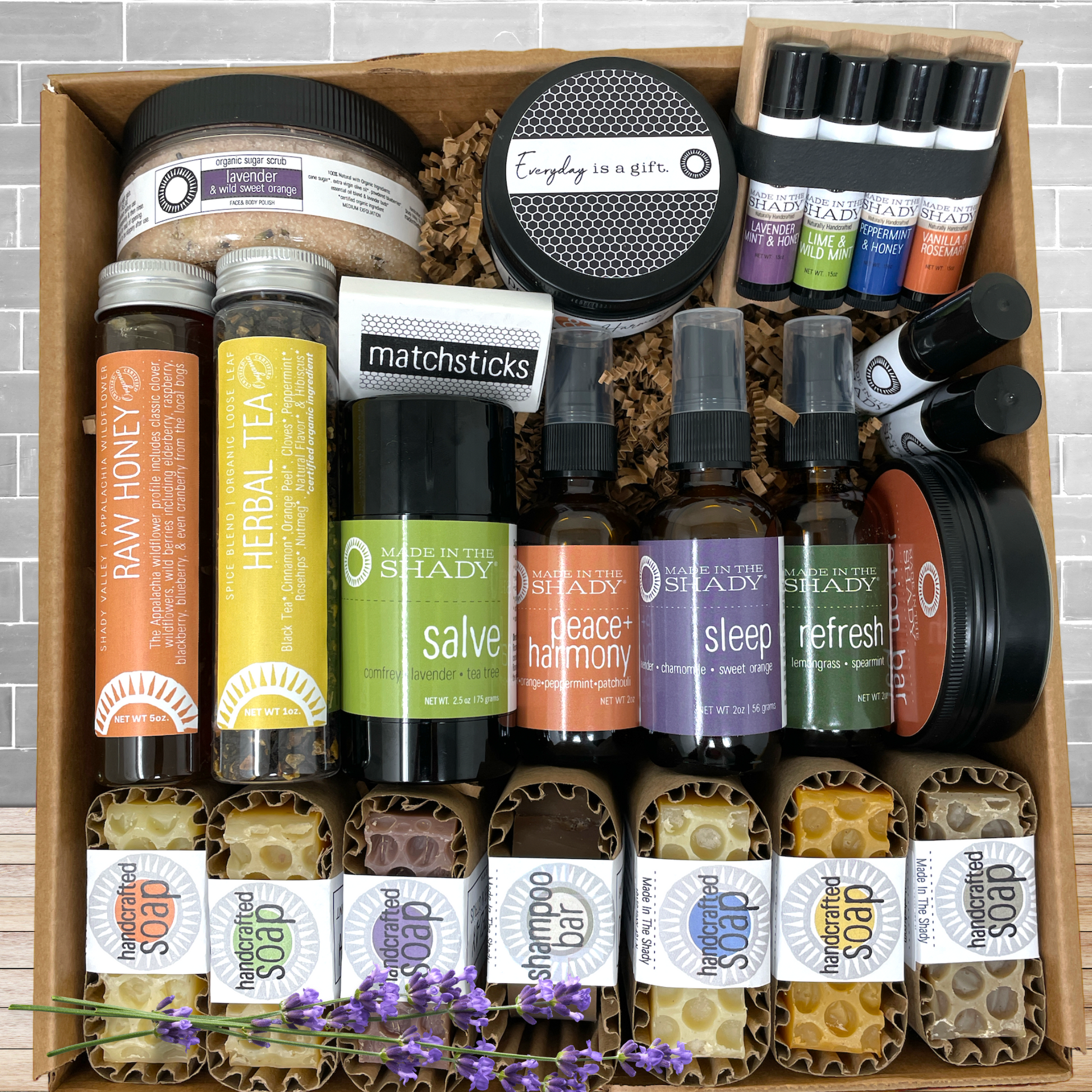 Spoil them with this ultimate, relaxing, Made In The Shady gift box that they can share with their spouse, family members, and friends. They'll want to dig right in. It includes our signature organic soap collection, essential oil aromatherapy trio sprays and duo rollers. Includes Appalachian wildflower raw honey and organic herbal loose leaf tea, along with a natural coconut wax fragrant candle and wooden matches and so, so much more!